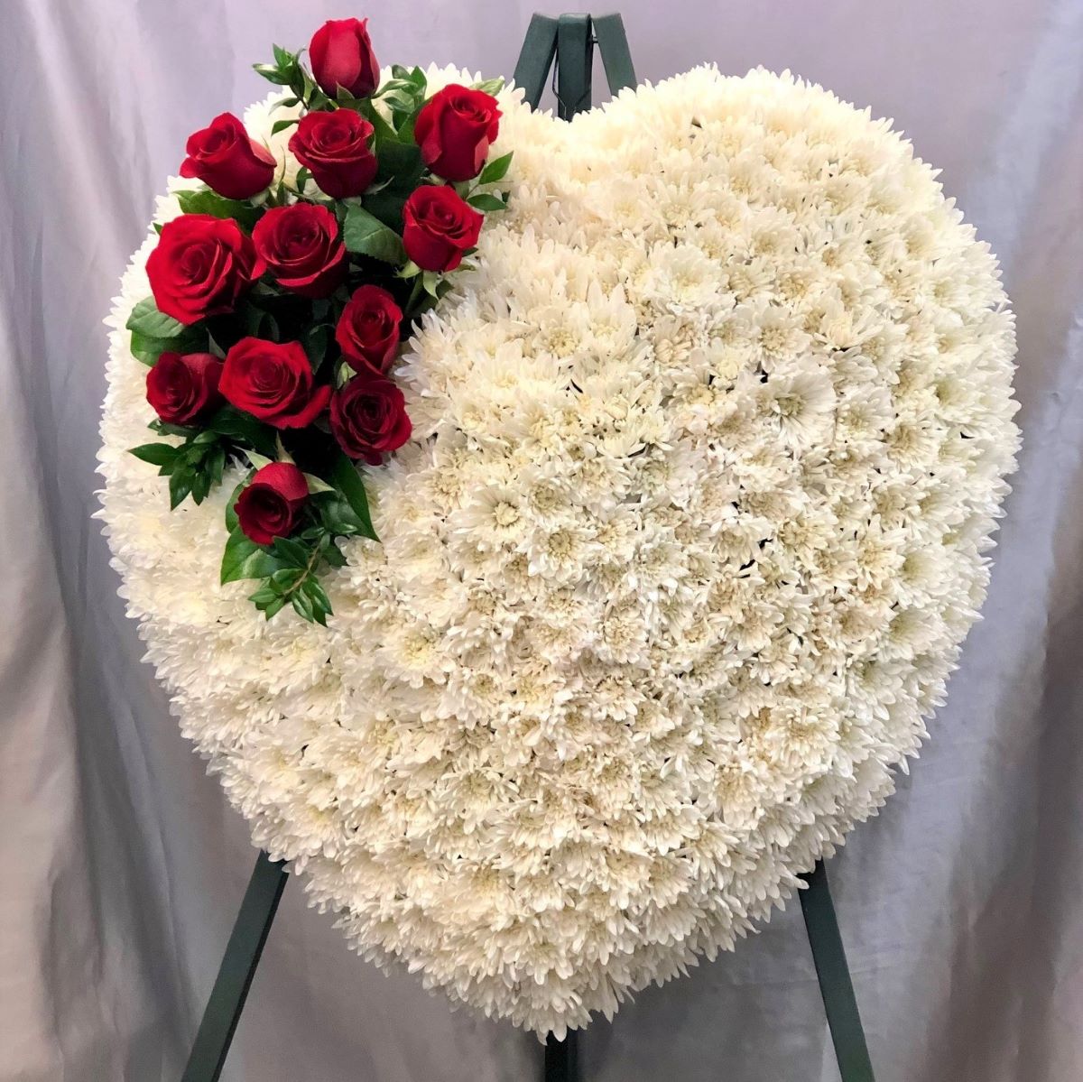 Solid heart wreath with white cushion mum, red roses