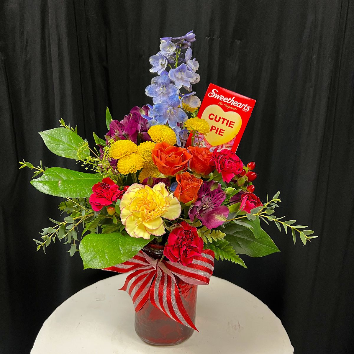 What goes together better than candy and flowers?! Conversation hearts and color fill this arrangement! If you want something bright, this is sure to please!