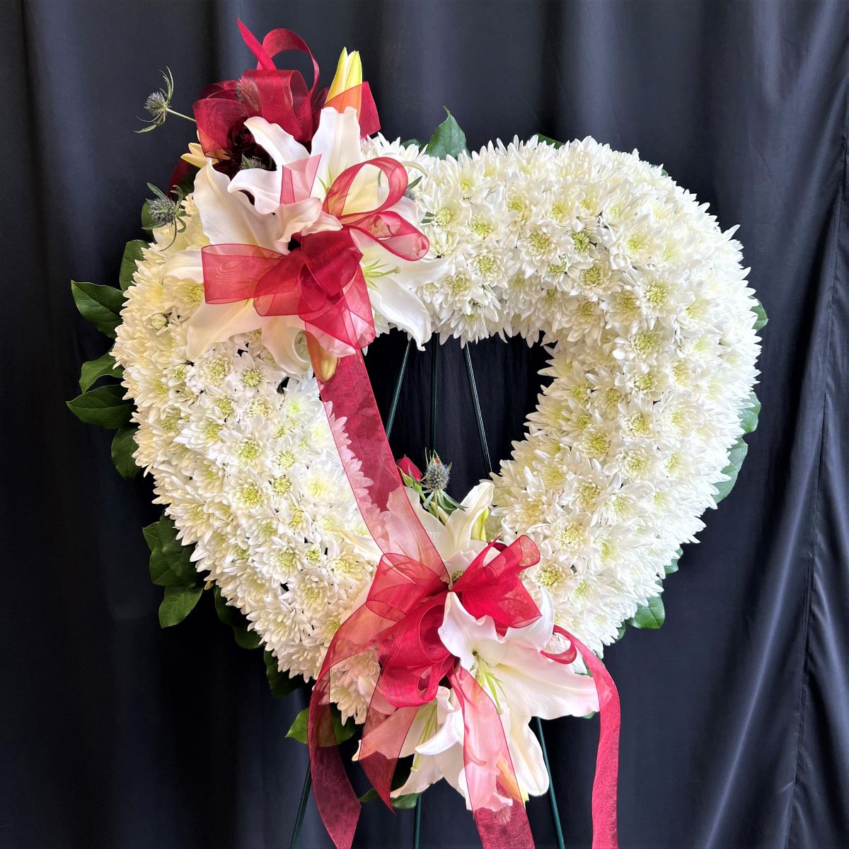 Heart Wreath with white cushion mum, attached Lilies with red ribbon